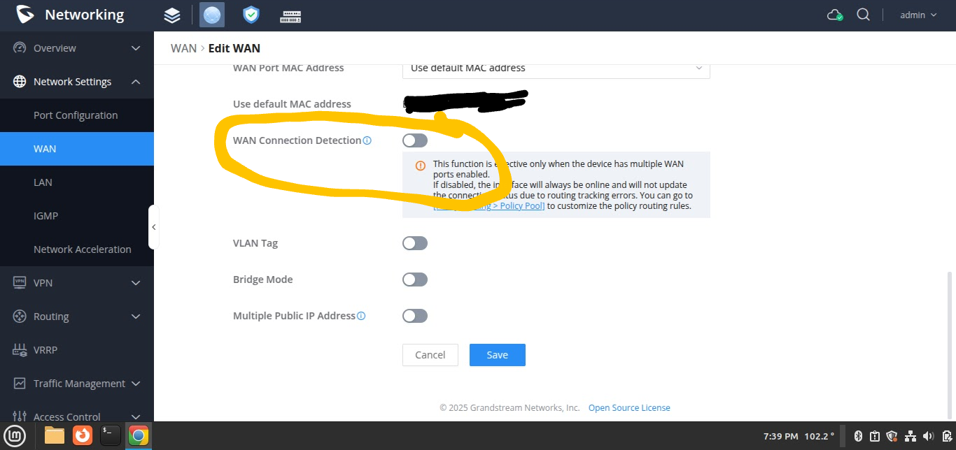 I checked and I still have all three interfaces listed with the weight set to one for each WAN. I only have one WAN connected. As I read that note under the Advanced WAN settings, if you do not have multiple WAN connections, then I see no reason to have that turned on. It is strange that my two are on, and not seeing any issues, and you have to disable it to make your issues go away. If this GCC is not in production, you might try and enable another WAN and see if it makes things run more smoothly. The problem might be that you only have one WAN enabled. As the note states “This function is effective only when the device has multiple WAN ports enabled”. This option turned on with only one WAN enabled may be confusing the GCC. Just a thought.