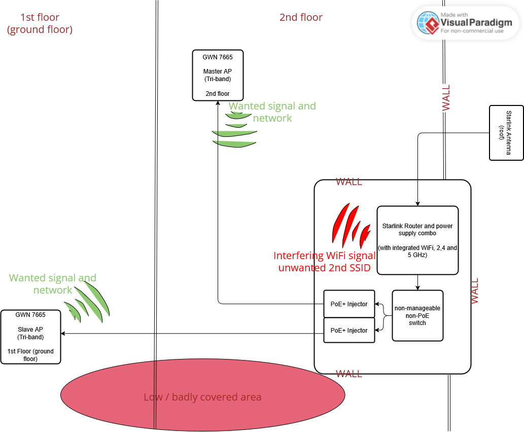 Starlink antenna → Starlink router and power supply combo (integrated wifi 2,4 and 5 GHz) → Network switch → PoE+ injectors → GWN 7665 APs (Master and Slave).