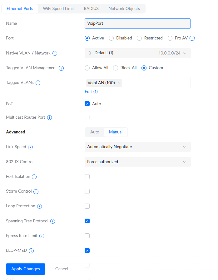 Pretty sure we want Navite to be default, then had to select Custom and my VoipLanand made LLDP-Med was checked. Apply change - then apply this profile to the port that my phone is plugged into.